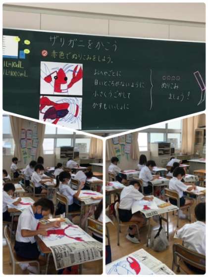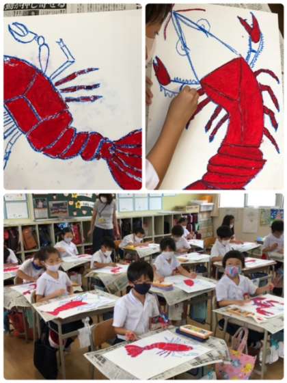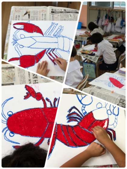 しっかりと赤のクレヨンを塗りこみ、迫力あるザリガニを仕上げています。完成が楽しみです。
