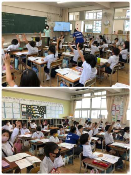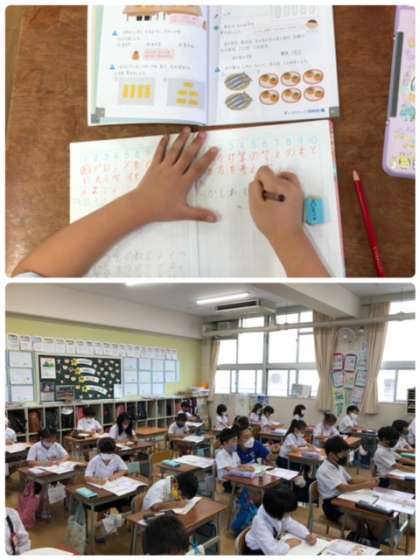 新しい計算の学習です。たし算、ひき算に続きかけ算の学習です。みんな楽しみながら一生懸命学習しています。