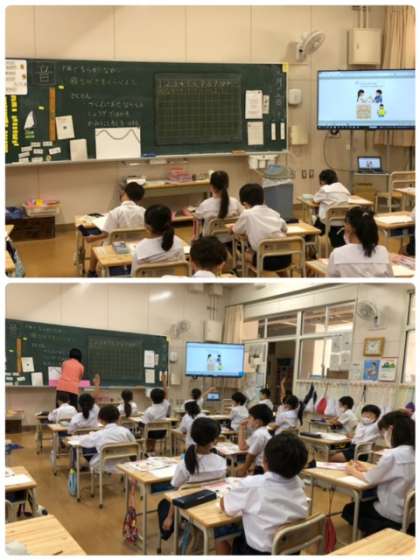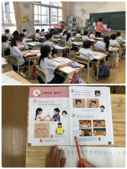 算数科で長さ比べをしています。見た目に惑わされず、正しく長さを比べることができたでしょうか。