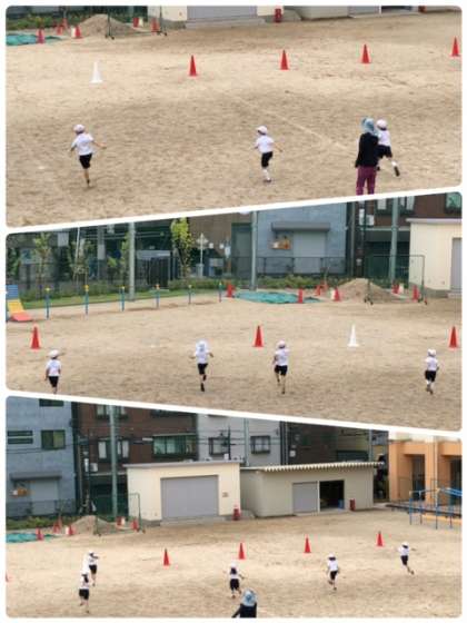 今日は運動場で、スキップや後ろ向きに走ったり、大股で走ったりと色々な走り方を学習しました。
