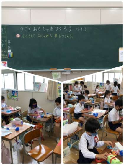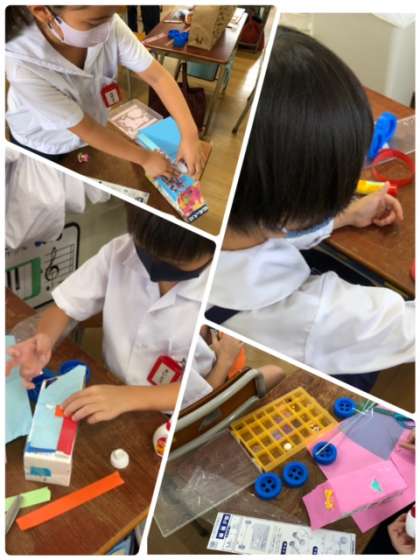 先日、完成予想図をかいた牛乳パックでの車づくりが始まりました。みんなハサミやバンドを駆使しておもしろい作品を作っています。