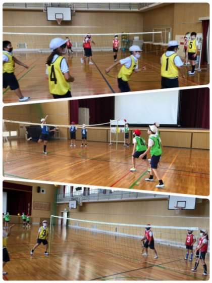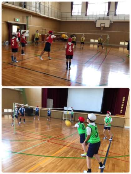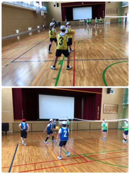 講堂でソフトバレーボールを学習しています。チームプレーはどうかな?