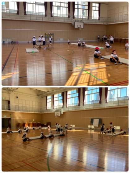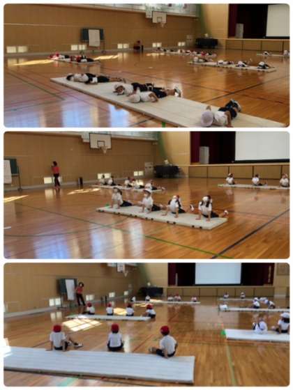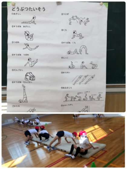 2年2組の児童が音楽に合わせて、どうぶつになりきりながら、体操をしていました。とてもユニークで楽しい取り組みでした。