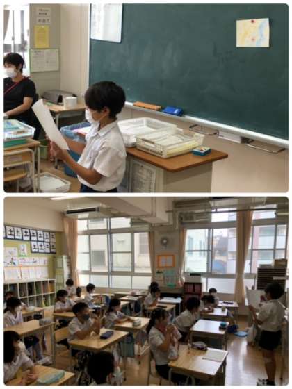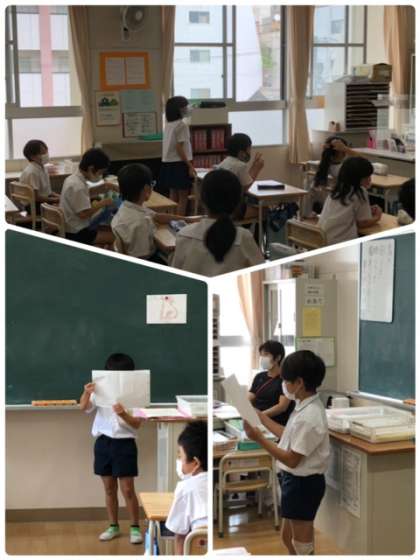 国語科の学習で、想像をふくらませてお話を作りました。そのお話をみんなの前で発表しています。
