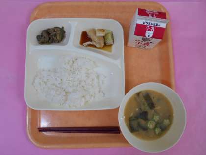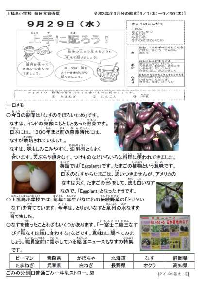 今日の副菜は、なすを使った一品です。なすは英語で「Eggplant」です。
