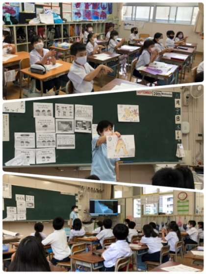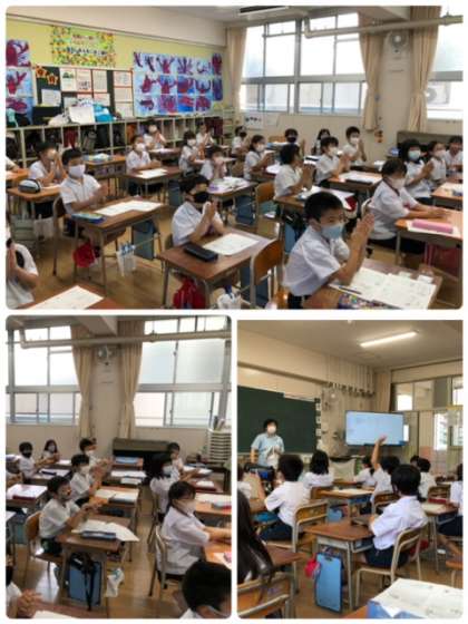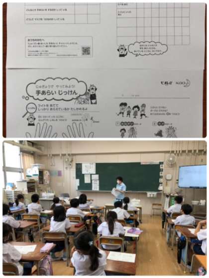 今日は保健室の山本先生に手洗いとマスクの着用について教えていただきました。てあらいでは、洗えていないところが、不思議なライトに照らすことで見つかりました。