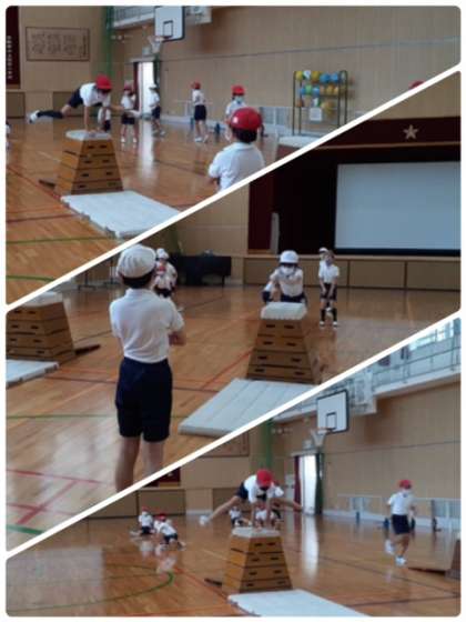 講堂で跳び箱運動に取り組みました。閉脚跳びに取り組む姿も見られます。