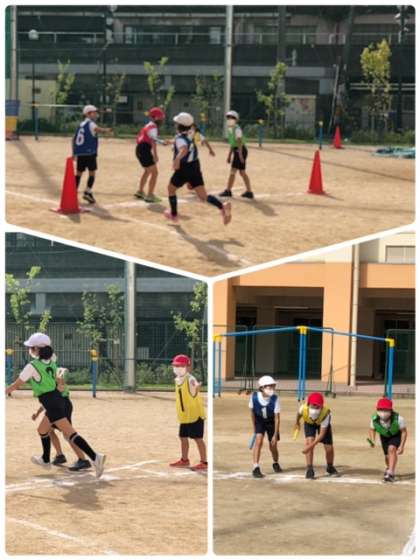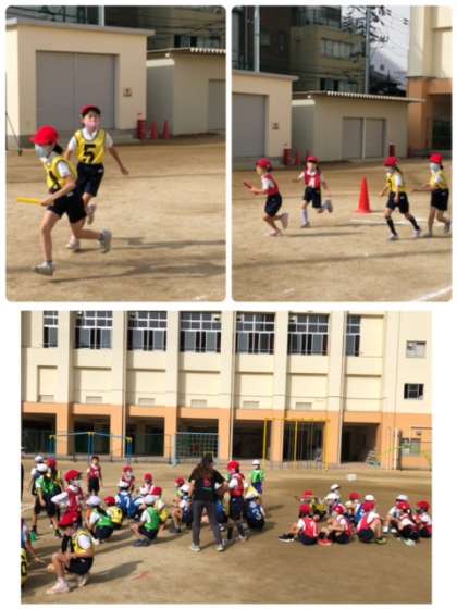 運動会に向けてリレーの練習です。初めてにしては、上手です!