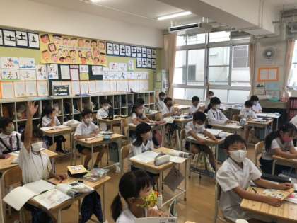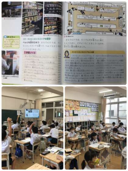 社会科の学習で、コンビニエンスストアとスーパーマーケットの違いについて考えています。身近な事もあり、たくさんの意見が出ました。