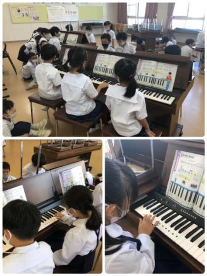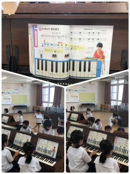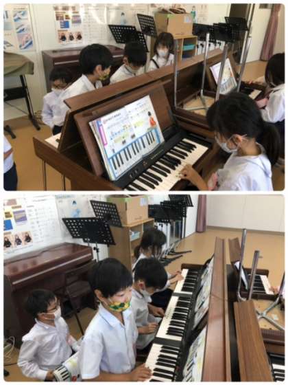 今日の音楽は、最上階にある音楽室で鍵盤を触って学習しました。とても、楽しんでいるようでした。