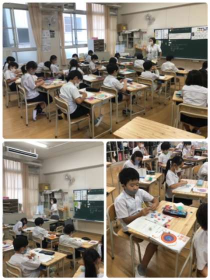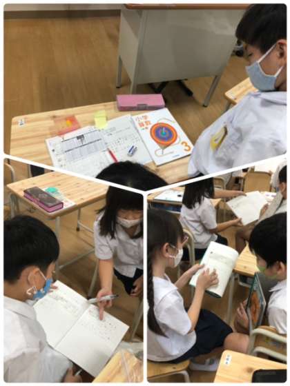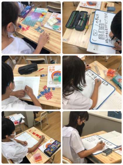 算数科のあまりのあるわり算を学習しています。考え方を証明するために、懐かしのおはじきを用いて学習していました。考え方を発表ボードにまとめている人もいました。