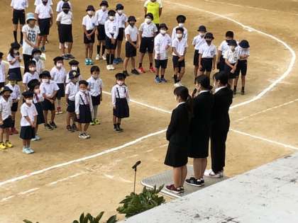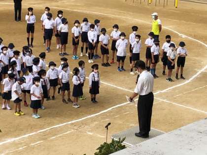 今日より、児童朝会を運動場で実施する事となりました。3年生が社会見学でおらず、全員集合とはなりませんでしたが、久々にみんなで集まりました。校長先生からは、秋の七草のお話、それから栄養実習に来られた3人の紹介がありました。