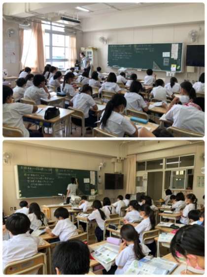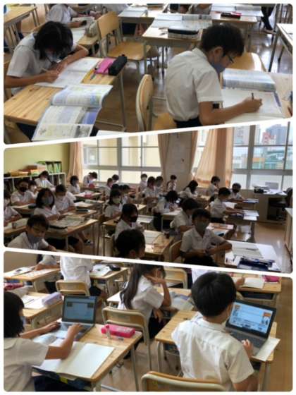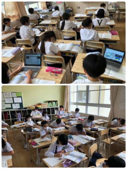 南海トラフ巨大地震についての調べ学習をしていました。教科書や、1人1台用PCを使って調べています。