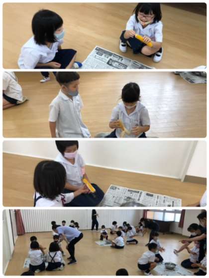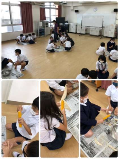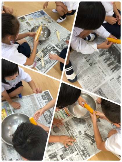 なかよし畑で育てた、とうもろこしから、実を取り除いています。