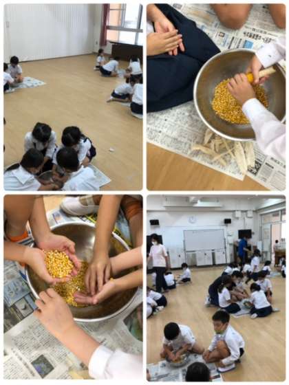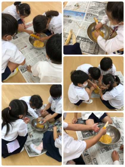先日の2組同様、ポップコーンの実を1組も取りました。なかよし畑で育てたとうもろこしの実をみんなで協力して取りました。次は食べる番ですね。