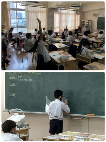 社会科の学習で、自助、公助、共助を学習しました。グラフを見ながら、たくさんのつぶやきが聞かれるいい学習でした。
