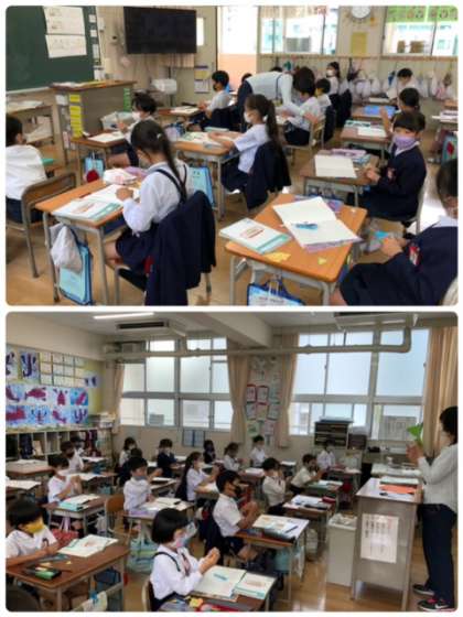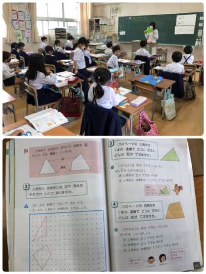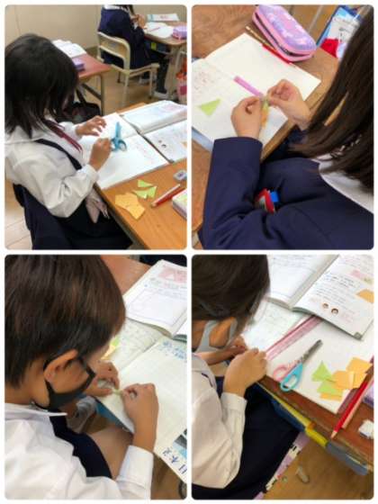 算数科の学習で、三角形や四角形を切ると、どんな形になるか考えました。思い思いに活動して答えを見つけたようです。