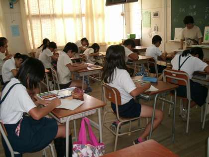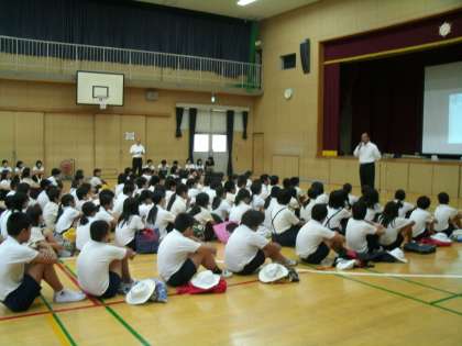最初は同じ中学校区にある福島小学校、玉川小学校、野田小学校、そして上福島小学校の4校が講堂に集まって話を聞き、その後自分が体験する教科に別れ、授業を受けました。
