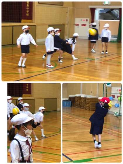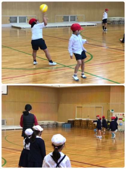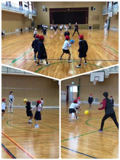 体育の時間に講堂でドッジボールをしています。なんとボールは2球です。みんな大忙しで逃げ回ったり、投げたりしていました。