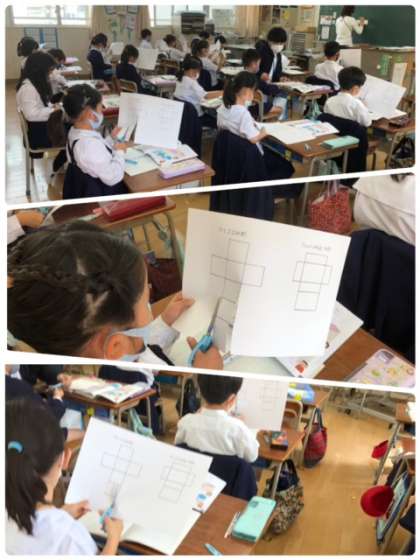 面をつなげて箱を作ります。丁寧に展開図が印刷された画用紙を切っていきます。どんな形ができるかな?