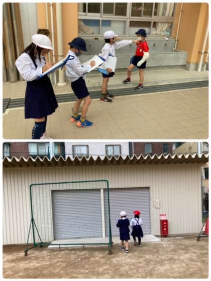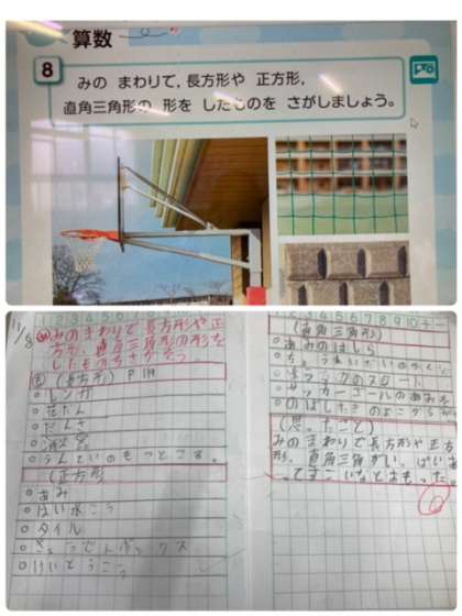 算数科の学習で身近なものからいろいろな形を探します。運動場に出て、辺りを見回しています。何か見つかったかな?