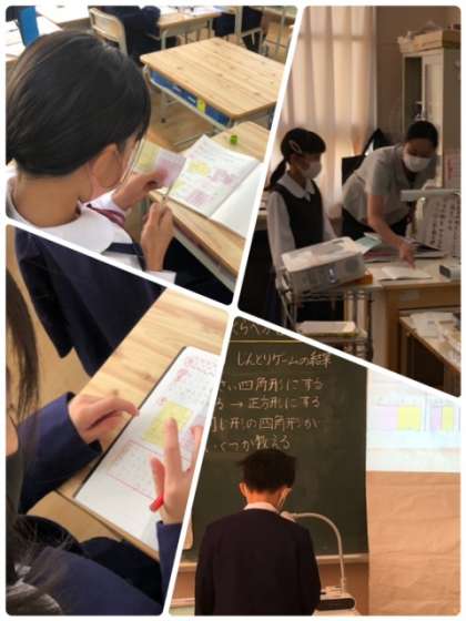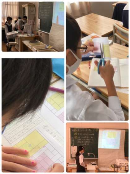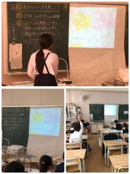 算数科の授業で、広さを比べています。ハサミで紙を切って比べ方を考えています。説明もしっかりとできてとてもおもしろい授業でした。