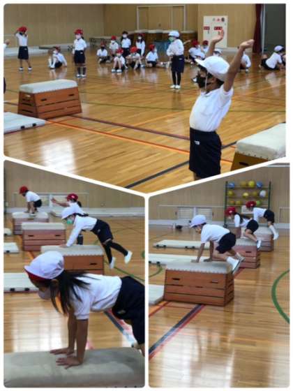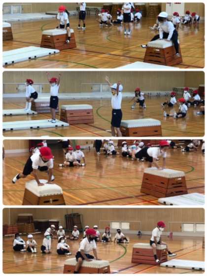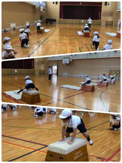 先週に引き続き、跳び箱の学習です。上手に跳べるように、跳び箱にまたがったり、腰を高く上げて跳んだりと、頑張っています。そして、マットに着地した時には、しっかりポーズを決めていました。