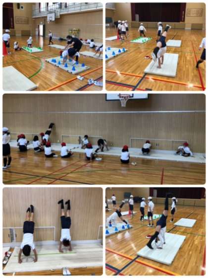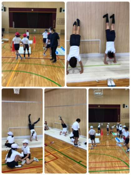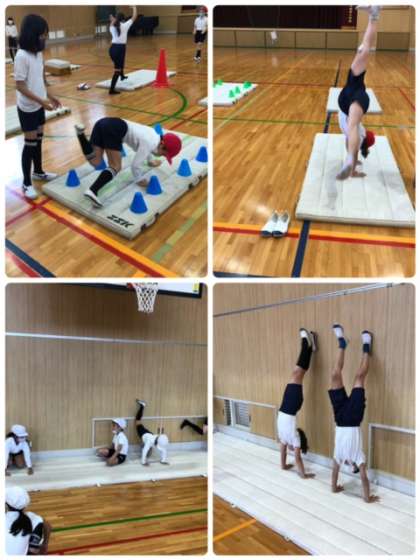 講堂で、側転と倒立をしています。たくさんの場づくりで、飽きることなく練習できています。
