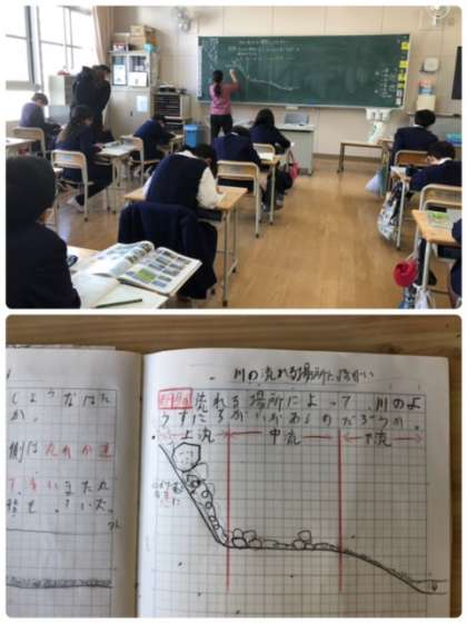 流れる水の働きの学習をまとめています。上流は…、下流は…、実験や学習を振り返りまとめています。