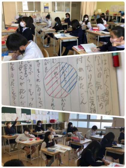 国語科のごんぎつねの学習で、登場人物兵十の気持ちを円グラフで表しました。みんなよく考えています。