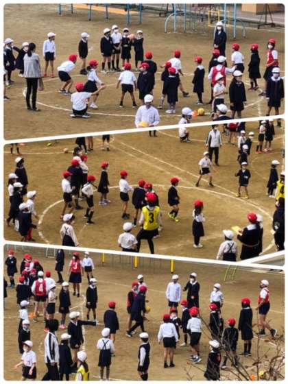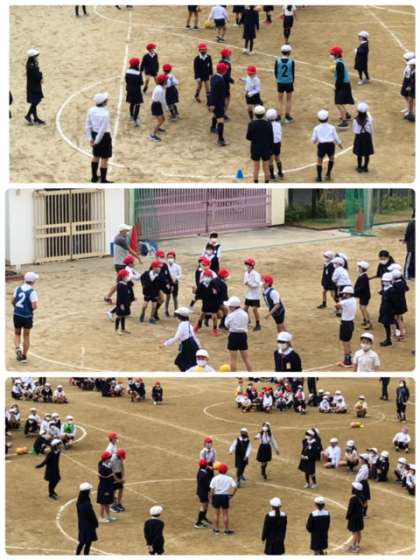 木曜日の朝は児童集会。たてわり班で協力して楽しく遊んでいます。今日は、ちょっと変わったドッジボールでした。