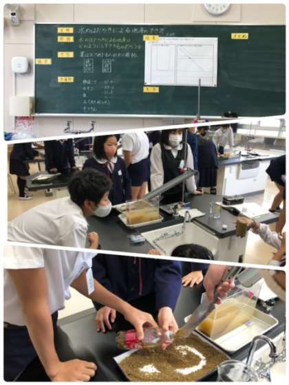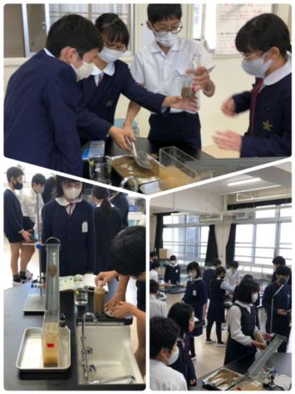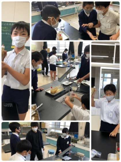 6年生の理科の実験です。砂と水をペットボトルに入れて振ったらどうなるか?楽しく実験をしていました。
