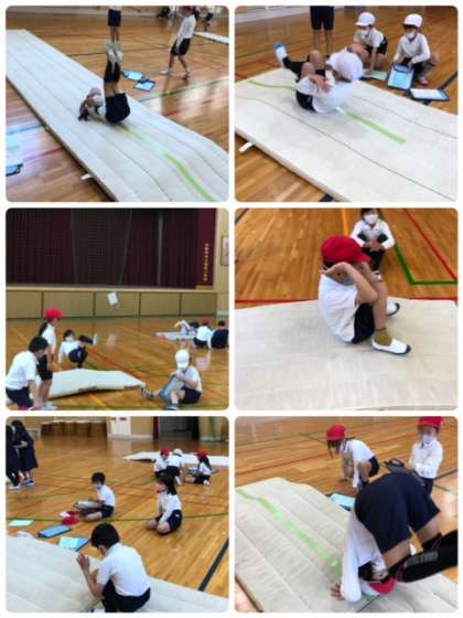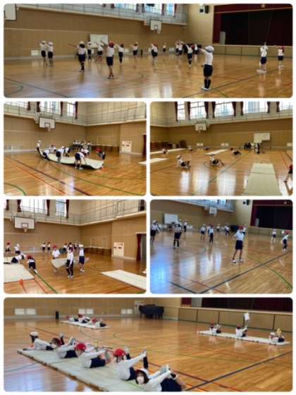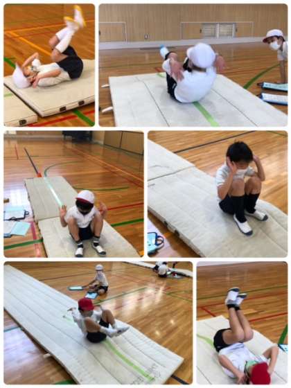 運動会で踊ったダンスを準備運動で行い、その後はいつもの動物体操、そしてマットでの後転です。準備や片付けまで子ども達だけで頑張っています。