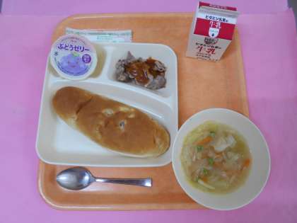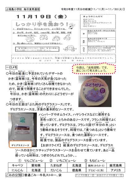 今日の給食の柿(富有柿)は生産量が少なく調達が困難なため、ぶどうゼリーに変更になりました。