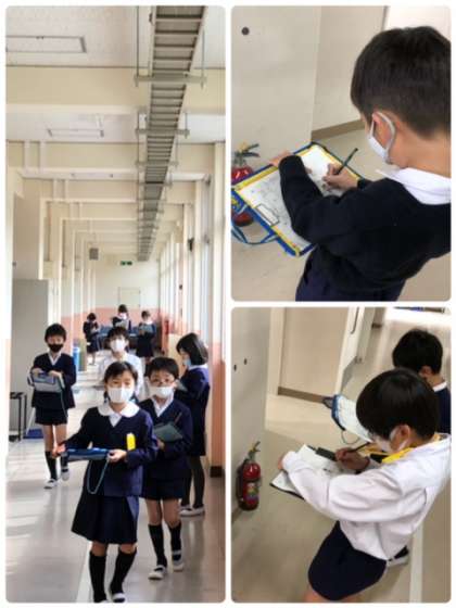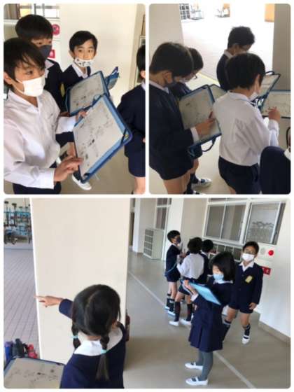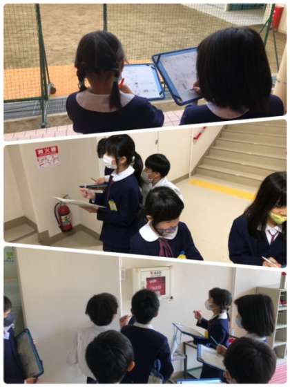 社会科の学習で、校内を周り消防設備などの場所を確認しました。「ここもある!」「こんなところにもある!」と楽しそうに学習していました。