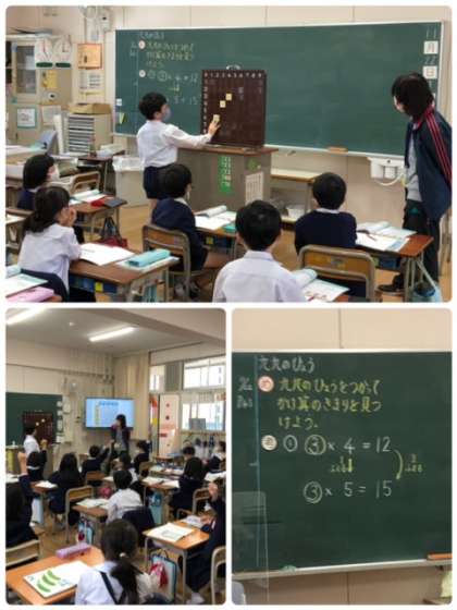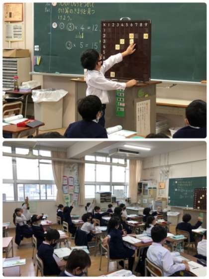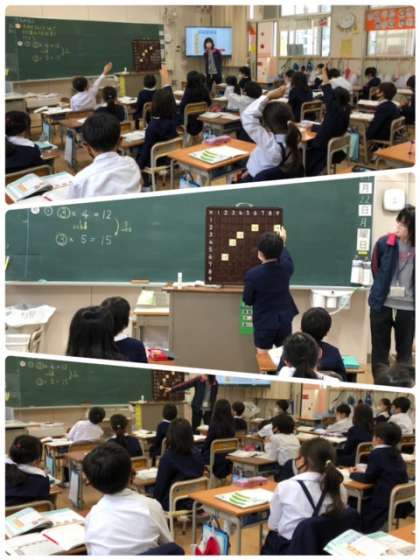 九九の表とにらめっこです。何かわかるかな?みんなが考えを出し合い、かけ算の決まりがわかったようです。