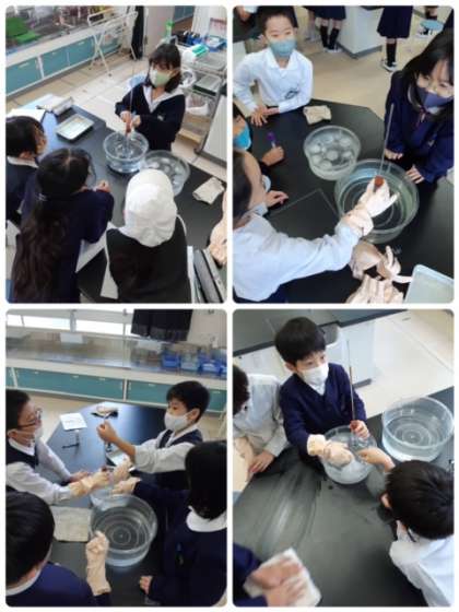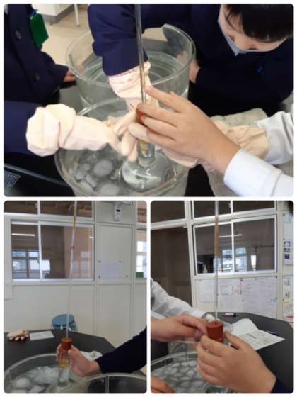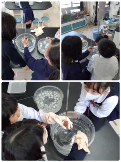 今日も空気を温めたり、冷やしたりして空気の変化について学習しています。実験の様子を見る目は、驚きと感動です。