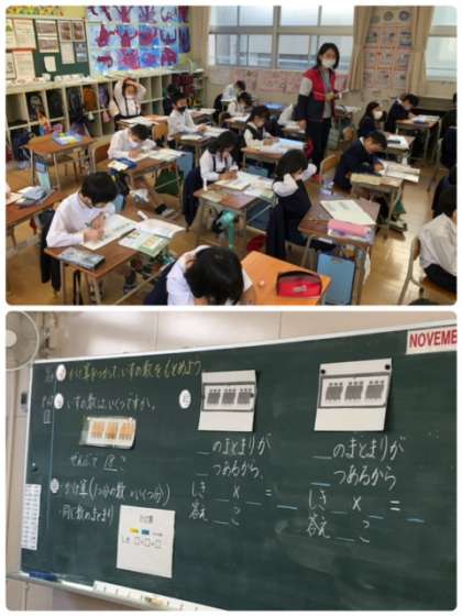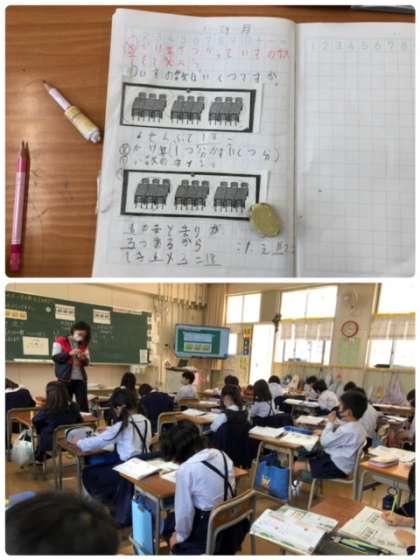 九九の学習も終わり、いよいよ九九を使って問題解決にあたる学習です。ノートにしっかりと考え方を書きながら学習を進めています。