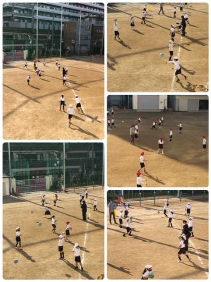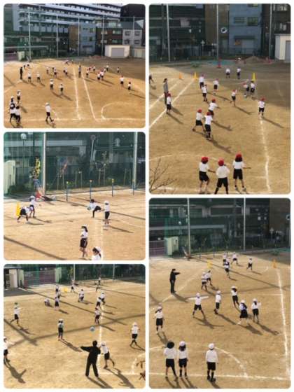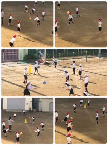 運動場で元気よくボール投げです。小さな手に大きなボール、少し投げにくそうですね!