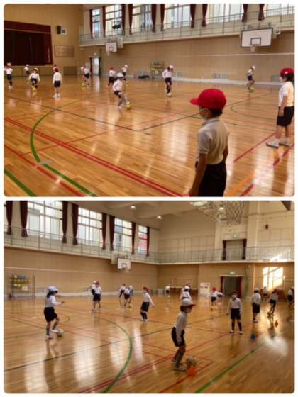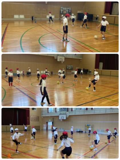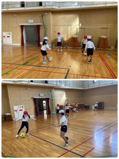 1時間目に講堂で、ボール蹴り遊びをしました。ドリブルやパスなど慣れないことをしながらも楽しく学習できたようです。