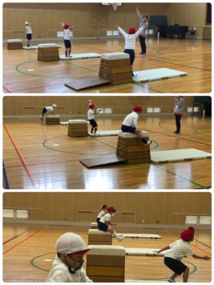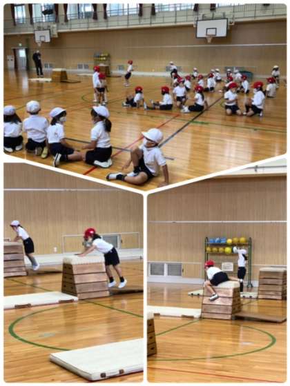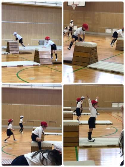 講堂で1年2組の児童が跳び箱をしていました。少しずつ高くなる跳び箱にも、果敢に挑戦していました。跳び終わった後のポーズはバッチリ決まっていました。