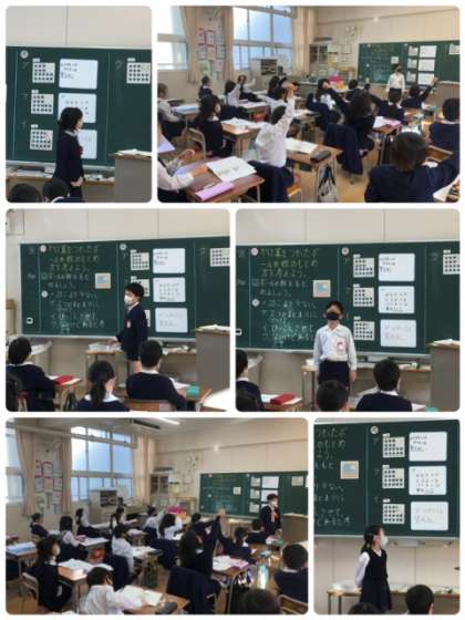5時間目に、2年1組で教員向けの公開授業がありました。九九を使って立式をしますが、たくさんの考え方が出てきます。グループで考えを交流した後は、みんなの前で発表しました。