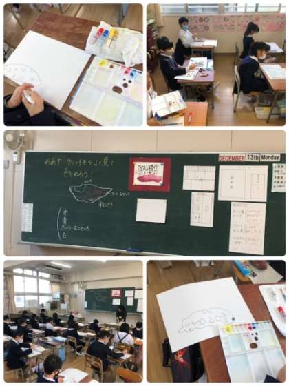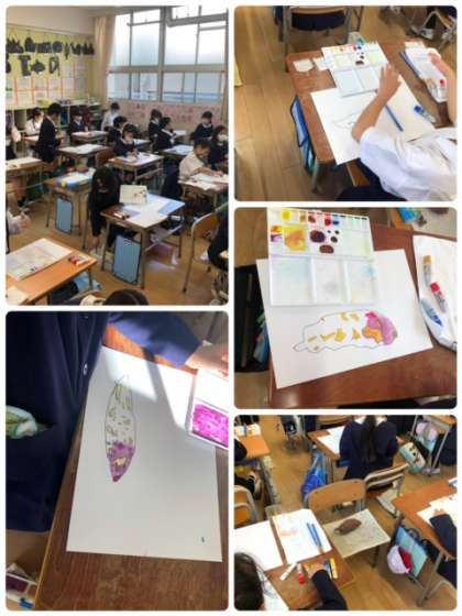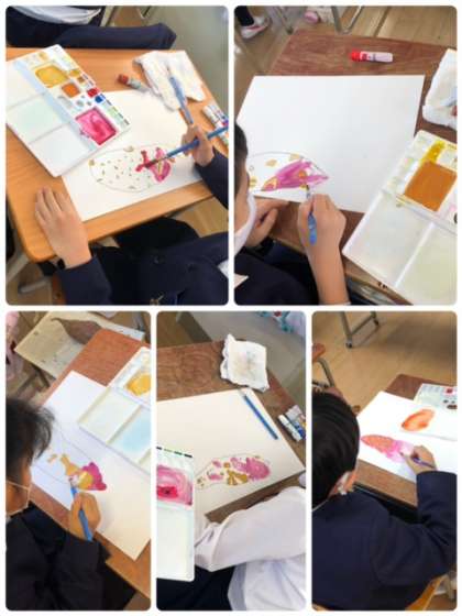 学習園で収穫したさつまいもを画用紙に描き、いよいよ色付けです。よーく見ながら色を作って塗っていきます。