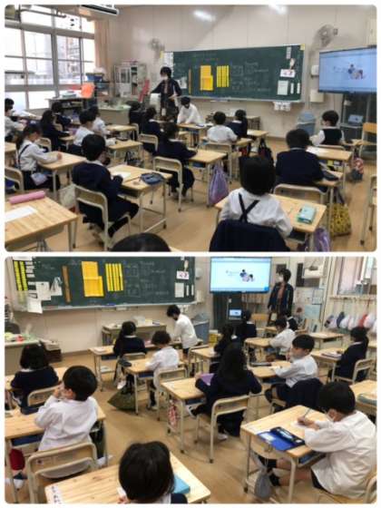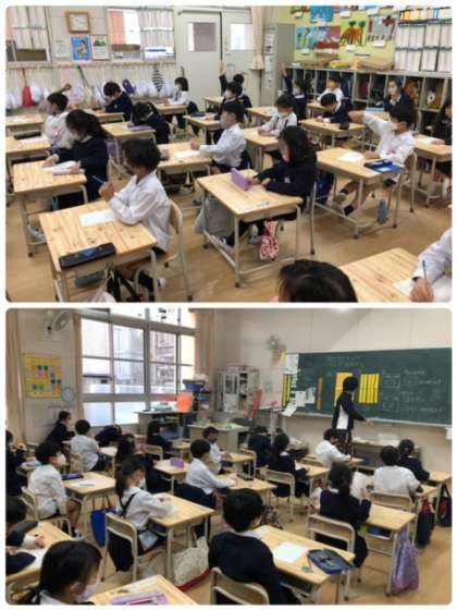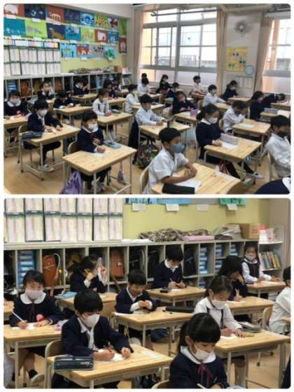 算数科の最後に、今日の確かめで先生が問題を読み上げました。みんな、耳で聞いた問題の答えをノートに書いていました。難しく思えましたが、よく頑張っていました。