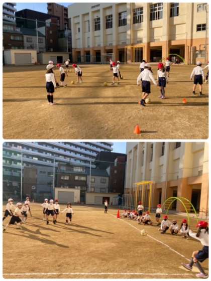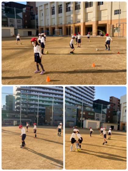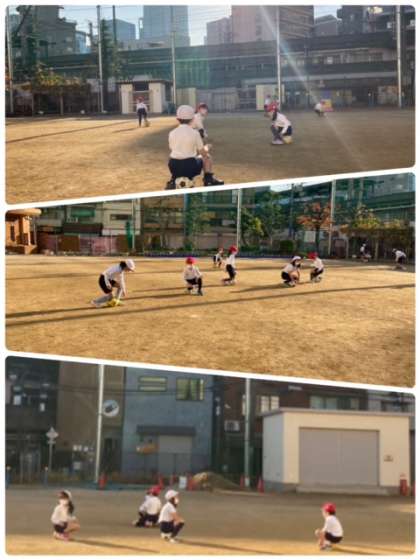 ボール蹴りも、とっても上手になってきました。相手に向けて蹴ったり、ボールを止めたりができるようになってきました。最後は、キックベースをしました。