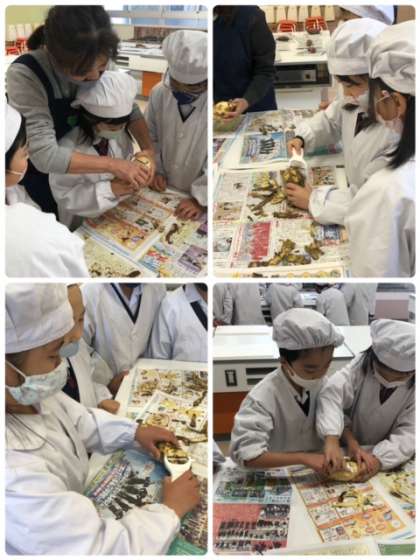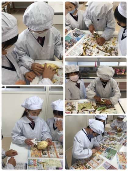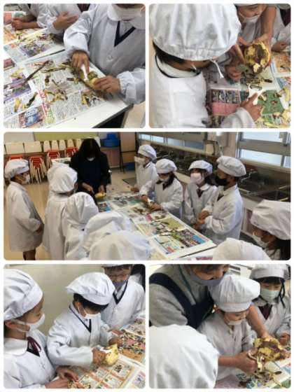 先日、学習園で収穫したさつまいもを食べるために、家庭科室で調理しました。ピーラーで皮を剥いたり、適当な大きさに切るなど頑張っていました。その後、蒸して美味しくいただきました。