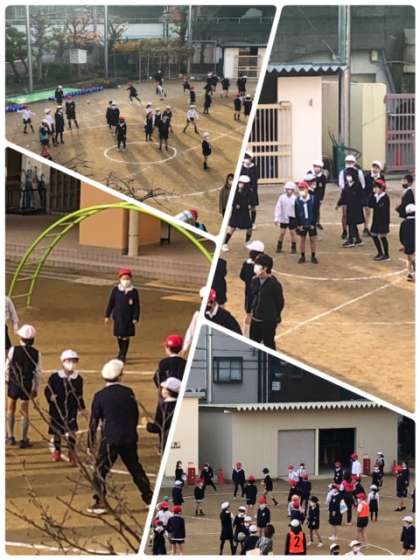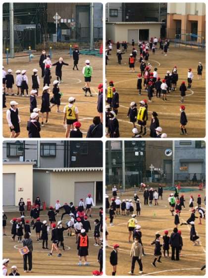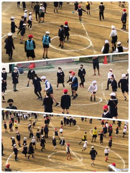 木曜日の朝は児童集会です。今日はドーナツ型ドッジボールです。全学年が協力して楽しく活動しています。