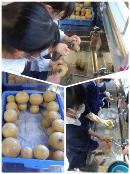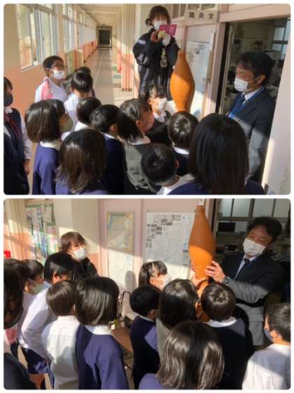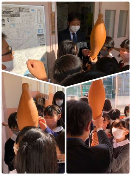 理科で、ひょうたんの学習をしています。冷たい水で洗うなど手間暇をかけています。今日は、校長室に置いてある大きなひょうたんの存在を聞き、見せていただきました。