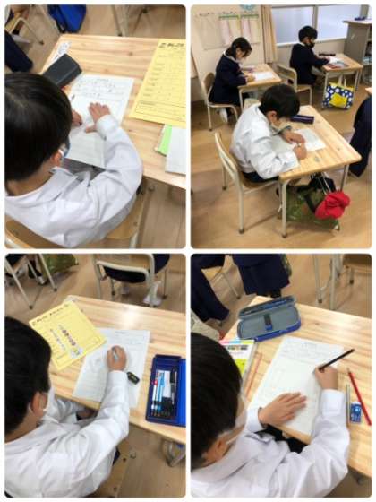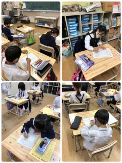 生活科の学習です。今日は、お家でお手伝いした事を絵と文で書いています。どんなお手伝いをしたのかな?