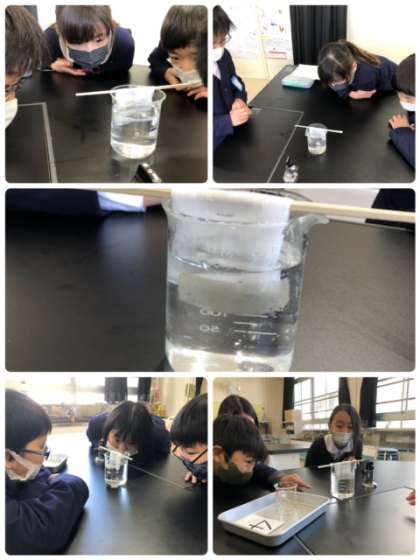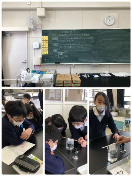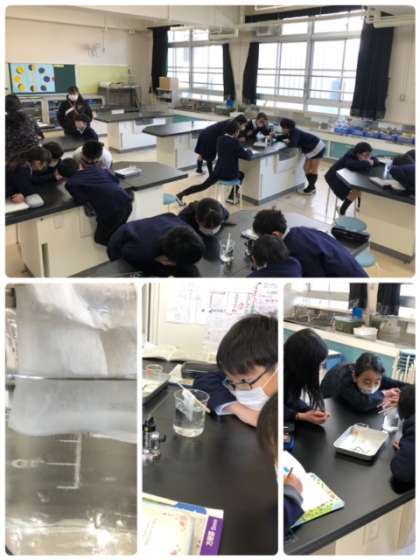 5年生が理科「ものの溶け方」の学習で、塩が溶けていく様子を観察しました。みんな、水の中に塩が溶けていく様子を幻想的に感じたようでした。